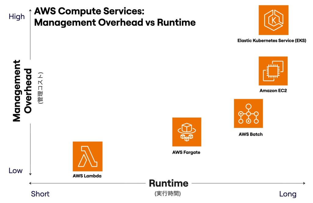 - 基本的に15分以内の処理に関しては、Lambdaが正解になる場合が多い。 逆に処理時間が15分以上になる場合は、Lambda以外が正解となる。